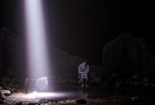We see John Doe in a very lonely place, sort of a hole or a cave underground with a shaft of light coming from an unreachable entrance. He looks very cold.