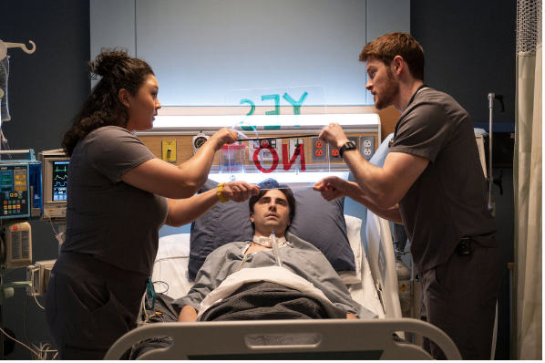 Dana and Van bring John Doe a big see-through plate of plexiglass with Yes and No written on it. (I suppose a whiteboard would be unphotogenic.) They ask him some questions -- can you hear me? Are you in pain? Do you know where you are? and he answers consistently. Someone’s in there!