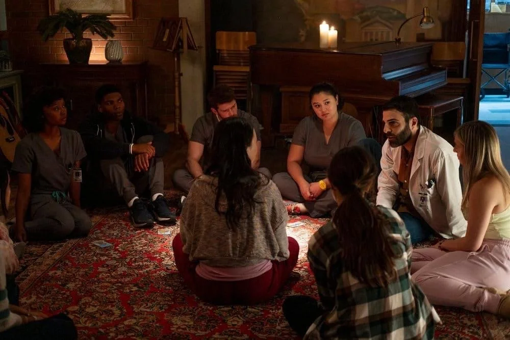 The interns are hanging out at Ericka Kenny’s house. Van says that he was able to coach that teen as she gave birth by focusing on Ericka “Steady, confident, brave. You were my anchor.” Aww, sweet. Dana says that she had a panic attack in the HS library because she was in her High School library when she got news that her little sister, Olivia, had died. Group hug.